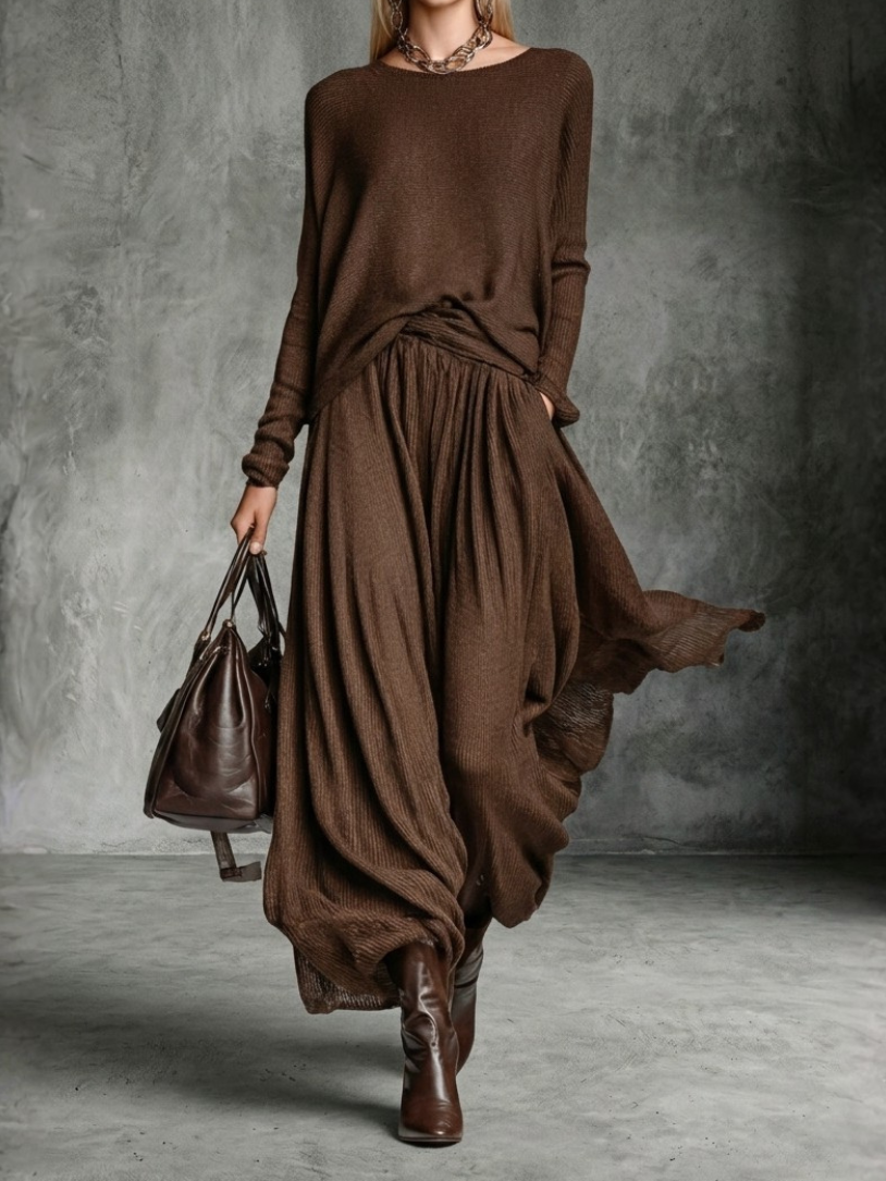 Veredle Ihren Alltagsstil mit diesem Strickrock- und Pullover-Set, das umhüllenden Komfort mit einer femininen und eleganten Silhouette verbindet.